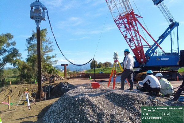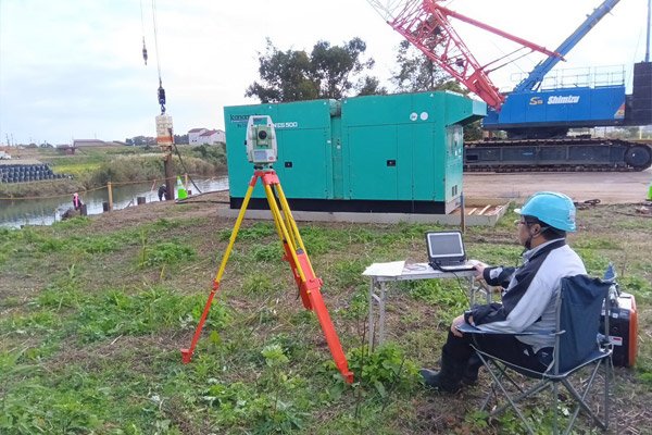 良くなかった点は測量機とパソコンをケーブルで繋いでいるので、雨が降ると養生が大変でした。また、バイブロハンマーで打設するので測量機を振動が影響しないところに据えなくてはいけないので、据える位置の選定に苦労しました。