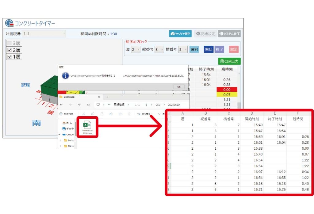 打設経過時間を正確にカウントし表示することで、定められた時間内に次の打設を行うための判断をサポートします。
